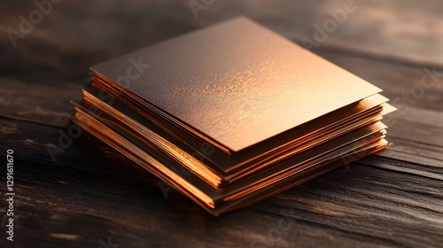 Stacked Copper Sheets on Wood: A close-up of a stack of copper sheets, their warm metallic surfaces reflecting the light against a rustic wooden surface.