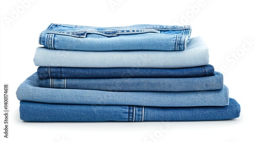Stacked Denim Jeans in Various Shades of Blue on a White Background