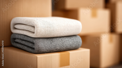 Stacked folded blankets or towels cardboard box storage or moving area, with blurred boxes background, creating cozy