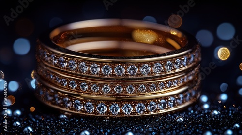 Stacked golden rings, each encrusted with gems, rest on a dark, glittery surface