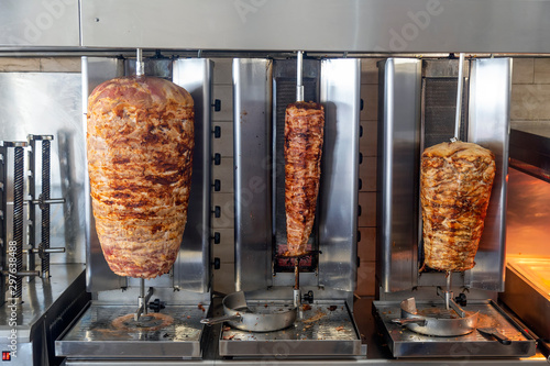 Stacked meat roasting on rotating vertical spit for gyros