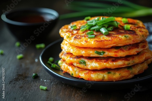 Stacked Pancakes on Black Plate