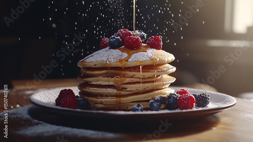 Stacked pancakes with syrup dripping down, fresh berries and powdered sugar on a rustic breakfast table