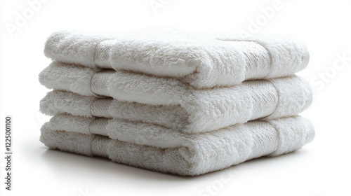 Stacked pile of soft fluffy white towels isolated for spa and home essentials advertising