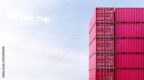 Stacked red shipping containers under a bright sky. Global trade, logistics, transport