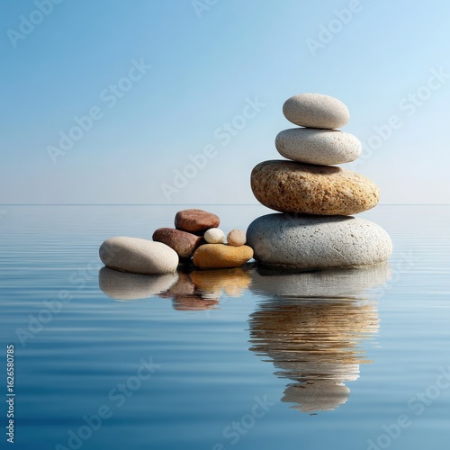 Stacked Stones and Loose Stones in Water Reflecting Blue Sky