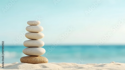 Stacked Stones on a Sandy Beach with a Blue Ocean in the Background. Spa relaxation. Copy space concept.