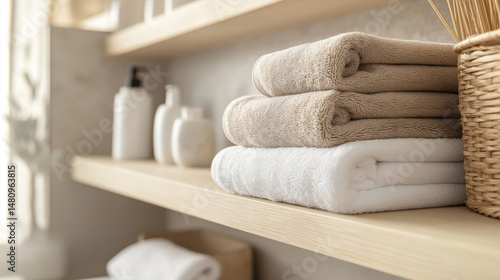 Stacked towels on wooden shelves with bottles and basket in bathroom