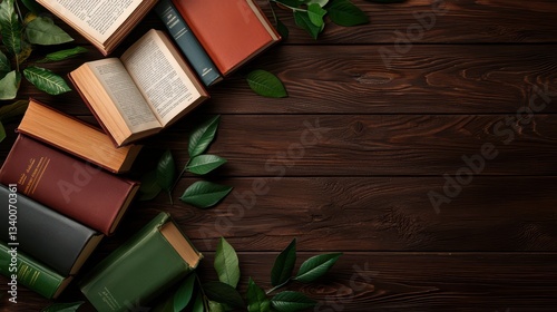 Stacked vintage books surrounded by green leaves on wooden table