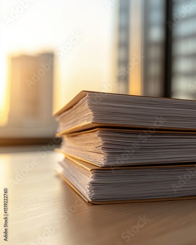 Stacked white documents on wooden desk with sunset glow and cityscape in background creating a warm atmosphere