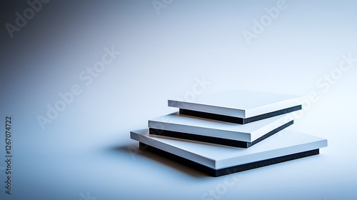 Stacked white panels on a smooth surface with soft lighting creating a minimalist aesthetic