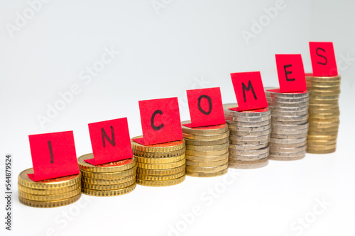 Stacks of coins, and above them red tickets that make up the word "incomes". Increase in revenues, earnings, and economic consequences. Increase in income and speculation