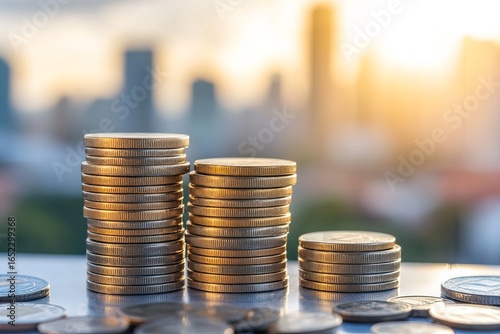 Stacks of coins, increasing in height, against a blurred cityscape sunset backdrop