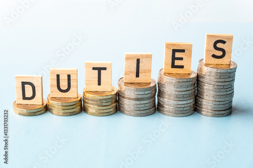 Stacks of coins of increasing height and wooden tiles that spell out the word duties. Consequences of new duties.