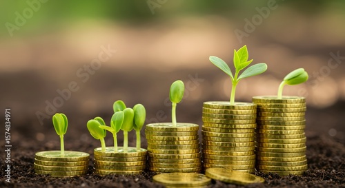 Stacks of coins with green plant sprouts, increasing in height, symbolize financial growth, investment, and sustainable savings. Set on a wooden table with a blurred green background.
