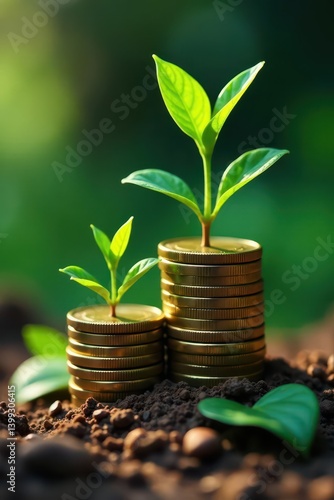 Stacks of coins with vibrant green plants growing from the top , sustainable, growth, investment strategy