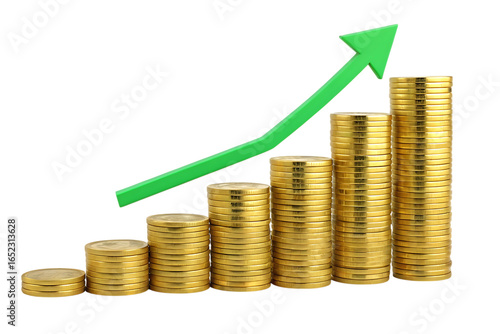 Stacks of gold coins increasing with a green arrow pointing upwards on a black background created with generated ai