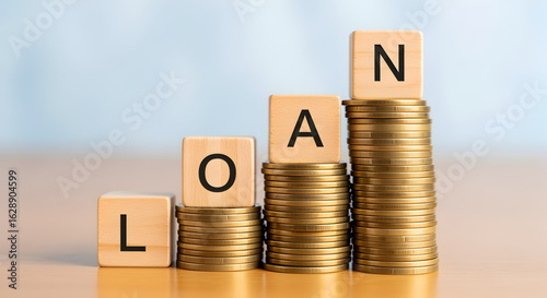 Stacks of Golden Coins and Wooden Blocks Arranged to Spell Loan in Ascending Order on Tabletop Against Blurred Background