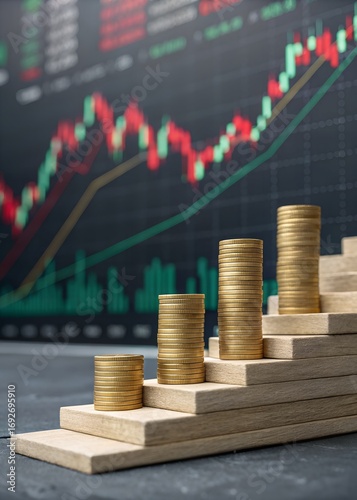 Stacks of golden coins climb wooden steps, representing financial investment progress and steady economic growth against a market chart.
