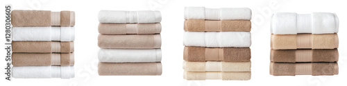 Stacks of soft fluffy towels in neutral shades of white beige and tan colors arranged neatly for a relaxing bathroom or spa like decor The towels feature a plush