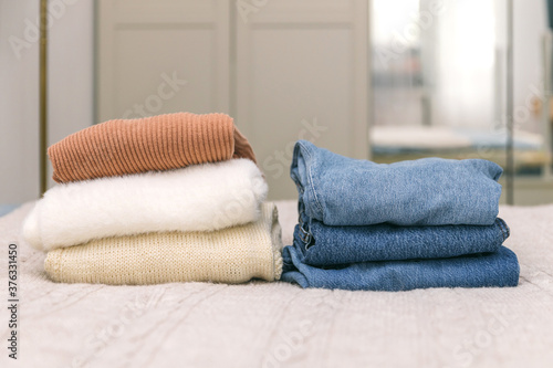 Stacks of sweaters and jeans. Cleaning out wardrobe, clothes placed on hangers and in drawers