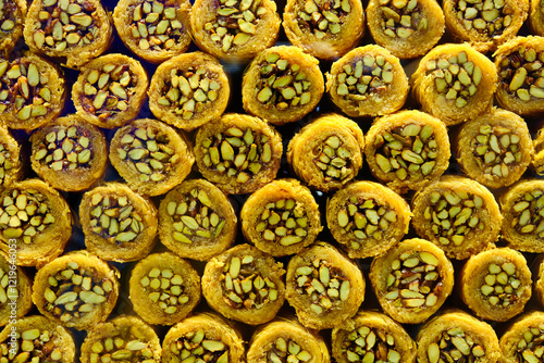 Stacks of traditional turkish sweets in a traditional turkish delights shop. Showcase of turkish confectionery