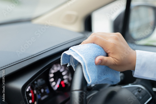 Staff is cleaning the car to prevent the corona virus