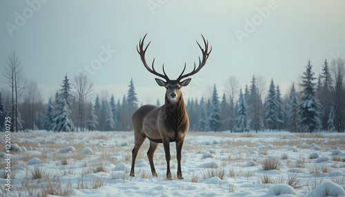 Stag, noble mood, standing in a snowy field, surrounded by pine trees in a winter landscape