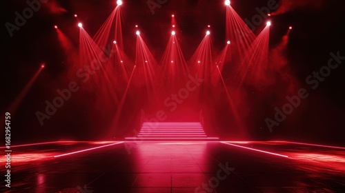 Stage glowing red, stairs ascending, spotlight beams cutting through