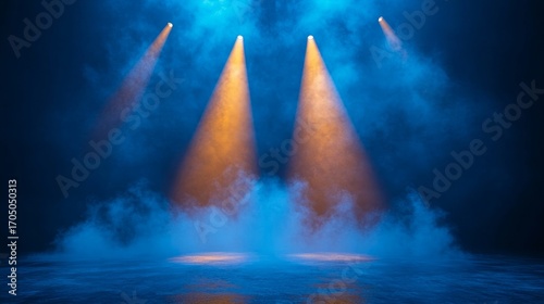 stage lights spotlight beam smoke effect background blue light show performance concert event spotlighting ,32k Resolution