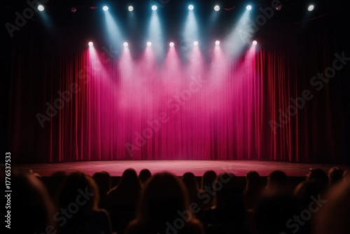 Stage of Anticipation: Empty theater stage with a majestic red curtain bathed in colorful spotlights. The anticipation and excitement of an event create a vivid atmosphere.
