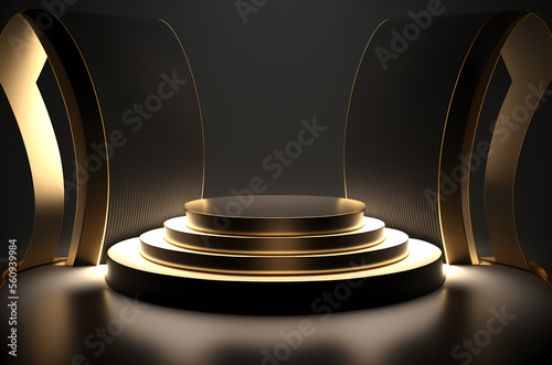 Stage podium scene for Award celebration on black background with lighting, generative ai.