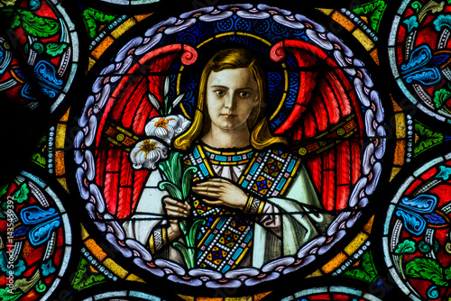 Stained glass (19th century) of an nice angel in heaven with flowers.