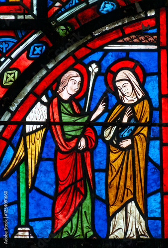 Stained glass (19th century) of Annunciation to the Blessed Virgin Mary by the Archangel Gabriel. .