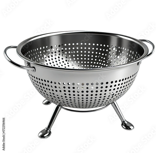 Stainless steel colander kitchen utensil, perforated, three legs, isolated