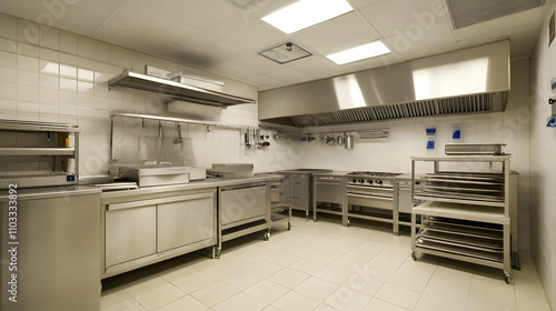 Stainless Steel Commercial Kitchen, Modern Design, Efficient Layout, Professional Cooking Space