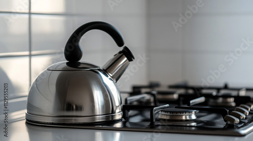 Stainless Steel Kettle on Modern Gas Stove Kitchen Home Cooking