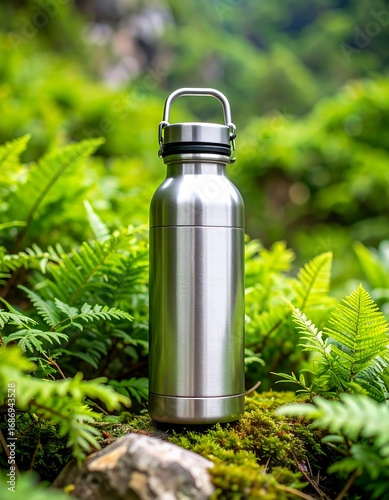 Stainless steel water bottle amongst lush greenery