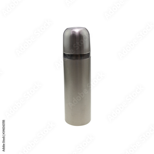 Stainless thermos water bottle, isolated on white background. Silver color.