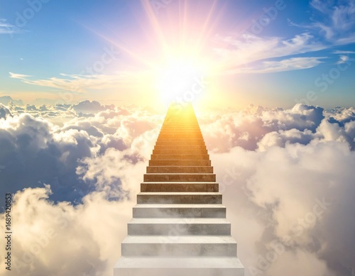staircase floating into the clouds, glowing sunlight at the top, success achievement concept.