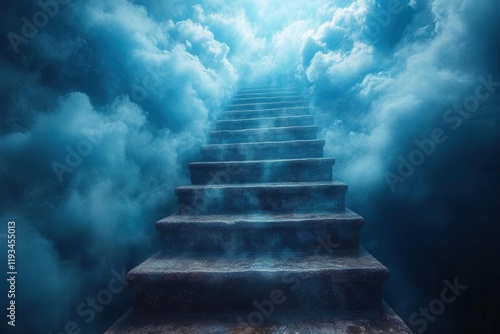 staircase leading up towards clouds, representing enlightenment and spirituality, with ethereal light filtering through, inviting contemplation and reflection on one's journey
