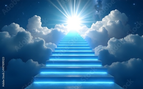Stairway to Heaven: A glowing blue staircase ascends into a heavenly realm of ethereal clouds and starlit skies, leading toward a radiant light. A metaphor for ambition, aspiration. High quality