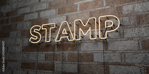 STAMP - Glowing Neon Sign on stonework wall - 3D rendered royalty free stock illustration. Can be used for online banner ads and direct mailers..