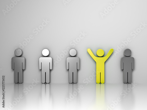 Stand out from the crowd and different creative idea concepts One gold man standing with arms wide open among silver people on grey background with reflections and shadows 3D rendering