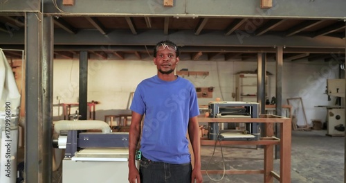 Standing carpenter wearing safety glasses holding tape measure in woodworking workshop with planer