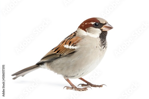 Standing House Sparrow Profile Isolated on White Background Close Up Shot