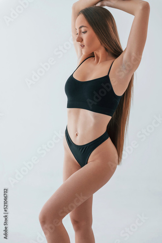 Standing in black lingerie. Woman in underwear with slim body type is posing in the studio