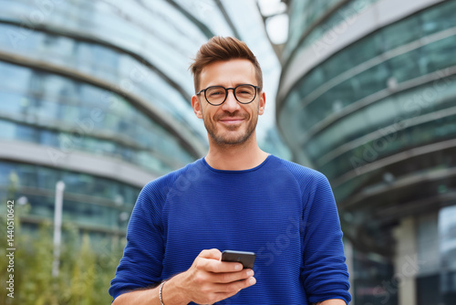 Standing in the city near an office building, a young caucasia businessman smiles as he checks financial banking apps on his smartphone. Focused and confident, he holds the phone securely in his hands