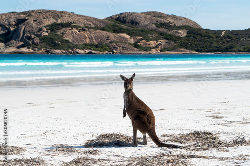 Standing kangaroo on the beach during the beautiful sunny day in Lucky Bay, Australia (Western Australia, Esperance, 2019)