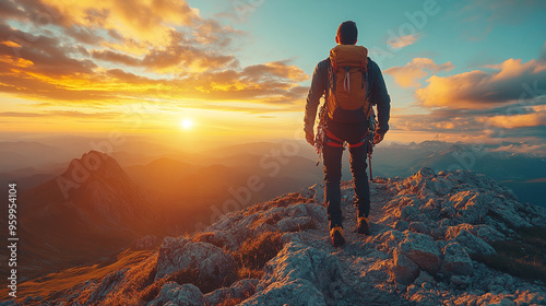 Standing man against the background of dawn on a rock, concept of achieving a goal